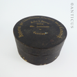 Measuring 15 cm diameter and 7.75 cm high, this quaint old box has a black grained card finish to the exterior, and a purple card finish to the interior. I can’t read the Gothic lettering to the lid, but it might be something to do with medicine (the German word for bloodless is there). Some marks etc to exterior as per age and usage. Could be touched up.