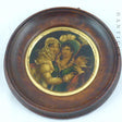 Miniature painting: a round oak frame with gilt inset framing a portrait of three women in Georgian period clothes. Nicely painted, fine crackle and some larger cracks to surface, but only noticeable under magnification or against the light. Can't tell what it is painted on - possibly vellum. Not canvas though, and not thick enough for board. Very good condition. Whole measures 13.5 cm diameter.