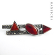 Stylish Deco two-bar brooch made in silver, and set with marcasite. There are three geometric panels mounted on this, two triangular, and one oval. They are set with carnelians (or cornelian, same thing). Brooch measures 1.7 cm high by 6 cm long. Excellent condition. Swivel safety catch. Circa 1930s-50s.