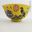 Chinese Imperial yellow rice bowl, hand painted, bearing the Dayazhai marks in iron red underneath and around the upper side of the bowl. The marks under the base read “Enduring Prosperity and Eternal Spring”. The oval painted mark on the bowl side is a rough rendering of the period mark “Spring throughout Heaven and Earth as One Family”, with not all the detail usually found around the border of the oval.