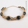 Vintage NZ jade (called greenstone or pouanamu locally) and 9ct rose gold bracelet. Intricate design to the links, which are mounted with tiny seed pearls and the greenstone jade oval cabochons. Safety chain fitted- clasp is push-in style, and the 9ct hallmark is on the rear. Bracelet would date from mid 20th century. It is a touch over 16 cm long, and 1.20 cm wide. Excellent condition - this is the prettiest example of these bracelets that I have seen. TW: 14.8g.