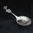Embossed scene of a couple holding hands in a village street with harvest vegetables or a fire below. Spoon has a raised seated lion finial, with wreath plaque below. Slightly hooked at rear to allow it to be hung over bowl edge. Spoon measures13.5 cm long - the bowl is 6 cm by 4.5 cm. Excellent condition.