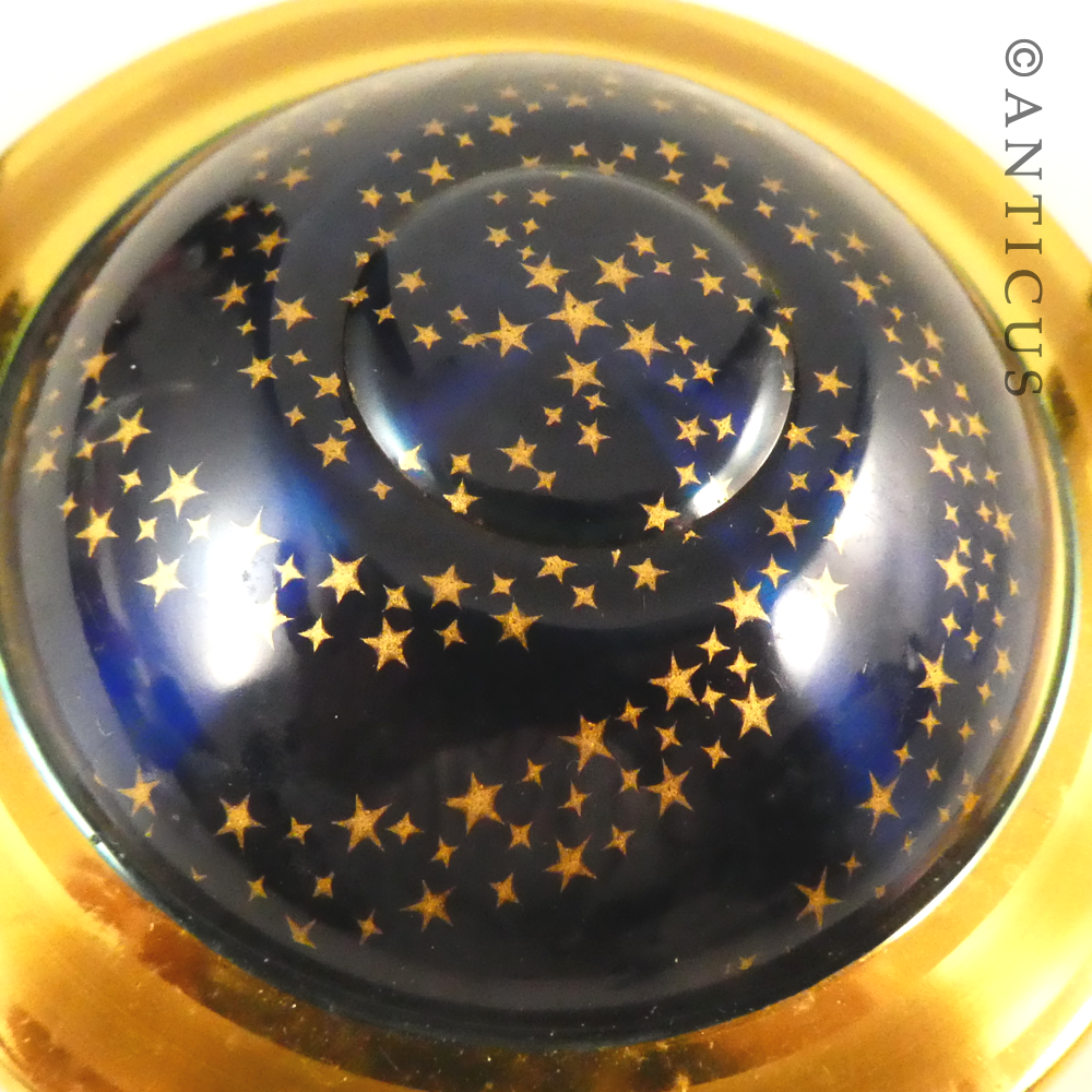 Iconic, beautiful and rare Kigu powder compact (there is one in the V&A Museum collections in London)  This design first launched in 1951. It has a rounded swirling stars globe surrounded by a flat platform of gold plated metal. The compact has never been used, it has no powder in it, and the filter and puff pad are as new. It comes in its own drawstring moiré black bag, in the original Kigu box. The case itself has a few minor scuffs on the metal. The  blue enamel star dome is perfect. It has the words “Flying Saucer” and trademark inside on the rim, and a Kigu logo on the rear of the pad. Item measures 72.25 cm diameter  (2.7/8 inches) not including the hinge and clasp.