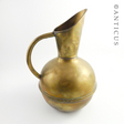 Art Nouveau brass pitcher vase, dating from early 1900s. Measures 25.5.cm high (10 inches) and approx. 17 cm diameter (16.3/4 inches). Decorative line detail to sides. It has a few dents in the under part of the base sides, in the top sides and around the flask top. However, it cleans up well and is a very pretty, slightly rustic look for flowers. I bought this myself as a decorative piece in an antique shop in London in the 1970s, and have used it for many years. Polishes up very nicely.