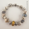 Sterling silver charms and base bracelet. Bracelet is snake chain style link, with clip-over clasp. Made by Halia, a North American company. There are two Venetian-style glass charms mounted in silver, 2 gemstone charms (one seems to be pink tourmaline, the other amethyst) and 13 other assorted sterling silver charms. There is also a "lock" charm - a small bead which you can open with a finger nail, but when closed prevents the other beads from sliding off when you are doing up the clasp. Of course the more charms you have on the bracelet, the smaller diameter you get, and the harder they are to put on your wrist. This one would probably need you to take off some charms, and maybe rotate which ones you wear depending on your mood at the time. With all charms on, the internal diameter is approx. 4.71 cm. TW: 49 grams. New old jeweller's stock. Excellent condition.