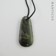 Whites, pale greens, dark greens and black colours. Suspended on a woven cord. Pendant measures 5.2 cm high by 2.4 cm wide. Gently bevelled both sides. Very good condition, a little age-mellow.