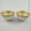 Very pretty pair of tea bowls (tea bowls preceded teacups). They have a cream body with gilded patterns internally and around the rim and foot rim. Even the gilded flower in the bowl base is intact. Bowls measure 8 cm diameter and 5 cm high. Very good condition, no chips or wear. Items would date from the mid 1700s.