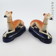 Measurements: 16.5 cm long and 6.5 cm wide (bases). Condition: There are faults - one dog has a rejoined nose and cracks or joins in the neck area. The other has a hairline over the forehead area and a rejoined neck. Both have hairlines along neck to spine area. Damage to Staffordshire ware is very common, as they are earthenware and fired at a lower temperature than porcelain. Age, of course, is also a contributing factor. (Small children playing with the pretty doggies is probably also a factor….). Good to get a true pair of these, they are getting very hard to find. These would date from the very early 1800s, and wear their scars with grace.