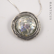 Sterling silver pendant, mounted with a dome of Roman glass, suspended on a sterling silver very fine chain. Contemporary make, with genuine Roman glass. Pendant measures 2.6 cm diameter, chain is41 cm long. Comes with a certificate of authenticity, stating that the fragment came from an archeological site in the Holy Land. The blue/pink/green patina on the glass is a result of chemical interaction of over 2000 years between the glass and the mineral-saturated soil. Excellent condition. There is more colour to the glass than the image shows.
