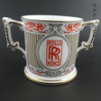 Two-handled mug, made by Royal Crown Derby, 1983. Commemorates 75 years of Rolls Royce at Derby, 1908-1983. Commissioned by The Sir Henry Royce Memorial Foundation to mark the 75th anniversary of the opening of the Rolls-Royce Derby works. Measures 7.9 cm diameter, and 7.4 cm high. Excellent condition. All gilded decoration intact.