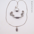 Pendant, bracelet and matching ring set, sterling silver with diamonds and rubies. The pendant is suspended from an Italian super-fine square profile snake chain (sterling silver). Pendant is mounted with 21 small diamonds, and a central marquise cut ruby. Bracelet has V-shaped links, and a similar motif of 42 diamonds and a marquise ruby. Ring has 22 small diamonds and a central marquise ruby. Pendant measures 23 mm long (including the bale) and 9 mm wide. The chain is 490 mm long. The ruby is approx. 5.5cmm by 2.25 mm, and is the same in each item. The bracelet is 108 mm long. It has a flick-over safety catch. The central motif is 33 mm wide by 11 mm. The ring fitting is NZ/UK size M (USA size 6) with an internal diameter of 16.51 mm. Face of ring measures 15 mm by 11 mm. All in very good pre-owned condition.