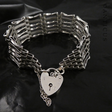 Very nice example of a 6-bar gatelink bracelet - sterling silver with heart padlock clasp and a safety chain. Decorative links, each having twist slats and straight slats. British hallmarks to one of the O rings on the bracelet for London 1977. The clasp is hallmarked for sterling silver, London 1979. Length is 18.24 cm, and depth of links is 2 mm. Excellent condition, a very attractive bracelet. TW: 22.6g.