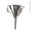 Beautiful little funnel for decanting cologne or perfume. It is hallmarked, but they are very rubbed through age. Probably European, maybe French - when a gentleman used to douse himself in cologne, and his valet could decant it into a small travel bottle. Same would apply to a Lady, who would travel with her perfumes and ungents in a pretty dressing box or case, and the funnel would be used to decant them into these small travel bottles in the box. It has a handle shaped as a branch with a flower and leaves and there is an applied Fleur de Lis to the front of the funnel. Item measures 5 cm long, and the funnel has a top rim diameter of 3.5 cm. Excellent condition. TSW: 11.7g.