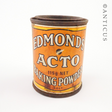 115g net Edmonds Acto Baking Powder tin, New Zealand. Empty of course. Measures 7 cm high by 5.5 cm diameter. Very clean tin inside, some surface light rust to the top, some age and usage staining to the label. Great little tin for a collector.