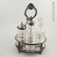 Oval EPNS table set of four condiment bottles on stand. The stand has rope-twist and beaded edges, with little shell feet and a handle with a heart scroll and finial. The bottles have silver plate caps, and two are used for pepper and mustard, with the other two having stoppers - presumably for vinegar and oil - or maybe some sort of sauce. All bottles are matching. The stand is in very good condition. The mustard spoon is a ring-in, but it works. One glass stopper is non-matching, not original and has a chip to the bottom of the plug end. All the bottle bases are in excellent condition. Item is approx. 24 cm high, 16.5 cm wide and 14 cm deep. This lovely set would date from mid to late 1800s. The silversmith's mark is for Atkin Brothers, Sheffield (England).