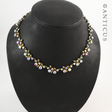 Pretty floral-style necklace, dating from 1940s or so. Multi-coloured rhinestones forming little groups with brass leaves. Colours of pink, green, blue etc. Length of necklace is 41.5 cm. Depth is 1.2 cm. One stone is absent, near the clasp, otherwise in very good condition, a pretty necklace.