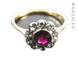 Small 18ct gold vintage ring, diamond cluster around a central ruby. Yellow gold with white gold mounts to the stones. The face of the ring is 9 mm diameter. The central stone is approx. 4.5 mm diameter. Ring fitting is NZ/UK size K+ (USA size approx. 5.1/4) with an internal diameter of 16 mm. Condition: the ruby has some abrasions to the edges of the facets - this can be seen under magnification, and is commensurate with age and wear. It came in with a broken mount under the base (the gold circle you can see underneath the ring in the last photo) - this has now been replaced. Very pretty dainty ring, probably dating mid 20th century or a little later.