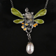 Gorgeous sterling silver pendant on chain - Art Nouveau in style with enamelled dragon-fly wings surrounding the head of a woman in headdress, with little orange leaves or flowers below her. A baroque genuine oval pearl drop hangs below the motif. In close-up, her face is glittery. Stamped to the rear "925" (which is sterling grade silver). The fine silver chain has a tag reading "Dutch Silver" on one side, and "Since 1825" on the reverse. Total length of chain and pendant is 40.5 cm. The pendant is 3.63 cm wide by 4.52 cm long. Excellent condition. Pre-owned.