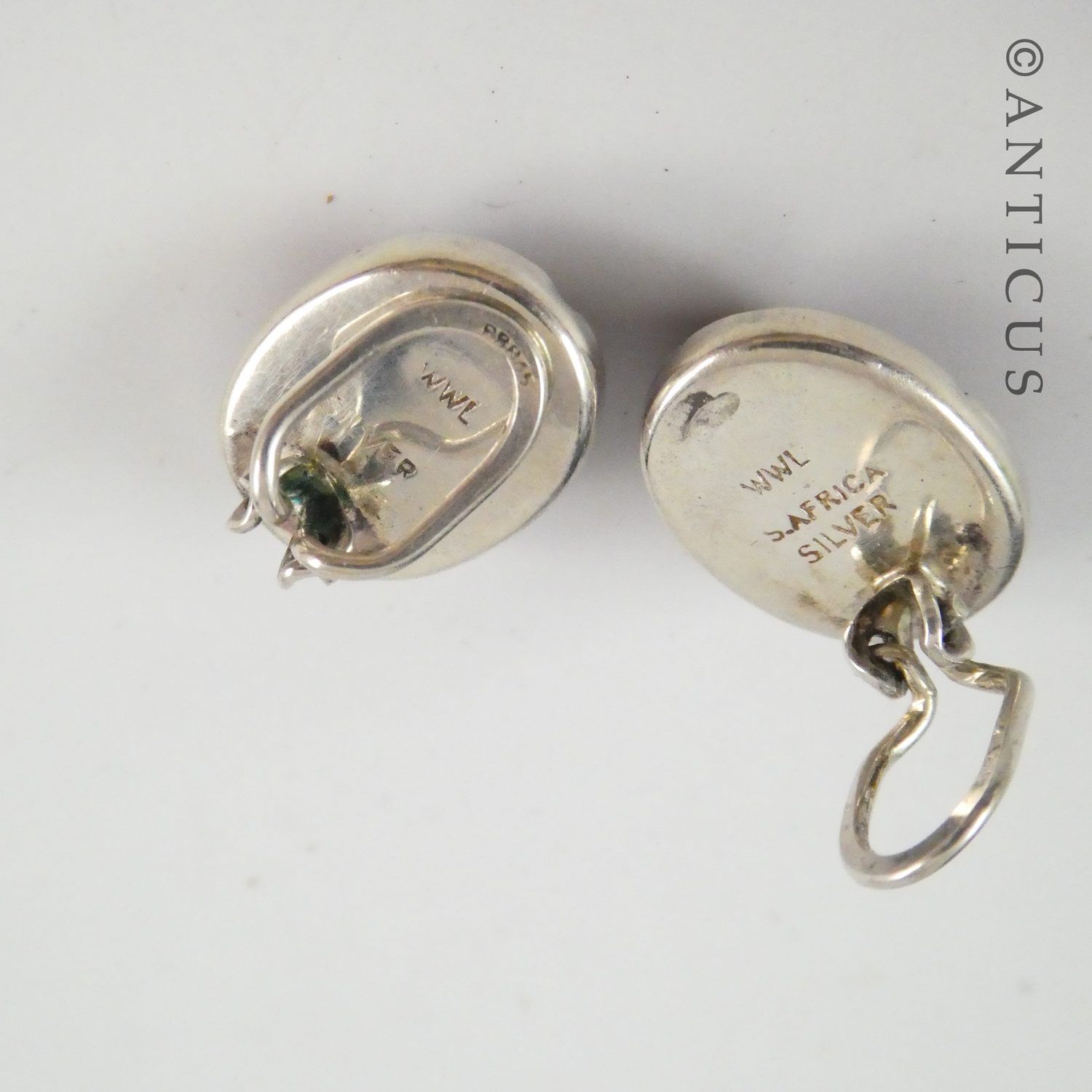 Unusual stone - oval domed dark orangey-red with black veins. Could be banded agate, or a jasper. Item comes from South Africa. Pre-owned. Face of earring measures 1.7 cm by 1.3 cm. The mount is a clip fitting made in sterling silver, and stamped "WWL. S.Africa. Sterling Silver". Very good condition.
