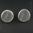 Concave Silver Disc Earrings with Hatched Design.