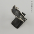 Silver with oxidised centre to the ribbon-like band, this ring is shaped as a curved ribbon around the finger. It has a over-lap tail. Should be worn on one of either the ring finger or middle finger - the tail would then be not sticking out. Lovely ring, very striking. Excellent pre-owned condition. Ring fitting is NZ/UK size P (USA size 7.1/2) with an internal diameter of 17.75 mm.