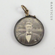 Early 1900s reversible photo locket, gilt bale and clasp, but the locket edges have lost their gilding. Old photos of a man on one side, and a woman, in the nursing uniform of the period, on the other. Item is 2.5 c m diameter. Apart from the gilding loss, it is in very good condition.