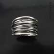 Sterling silver ring, made like strands of wires circling the oxidised background silver. Free-form, unusual ring. Face of ring is 1.4 cm high tapering to 0.085 cm at rear of the finger. Excellent new condition. Ring fitting is NZ/UK size P (USA size 7.1/2) with an internal diameter of 17.75 mm. Excellent new condition.