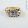 Four small round diamonds, mounted in square white gold settings across the face of the ring. Pre-owned. The face of the ring has edges of yellow gold, shaped like little gold balls, these are actually the curled over side mounts. The marks inside this ring read 5855, and it tests as 14ct (which is 585). Face of ring measures 15 mm wide by 8 mm deep. The band is 5 mm at the shoulders, tapering to 2.5 mm at rear of the finger. Ring fitting is NZ/UK size P (USA size 7.1/2) with an internal diameter of 17.75 mm. The ring is in excellent condition. TW: 5.5g