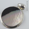 Mussel shell, with black and iridescent pinky mauve and white. Very attractive - mount is sterling silver. The clip secures at the rear, and folds up when you are placing the beads in it. Item measures 4.8 cm diameter. You can use beads or pearls up to 9 mm diameter. Some small bumps to one side of the mount, otherwise excellent new condition.