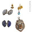 A few orphaned items, being sold as one bag. May be of use to someone. First item: A single earring - a tiny shell shape, goldplated. Stud style, for a pierced ear with keeper. Earring face measures 73mm wide. The second item is 18ct gold (0.6g), also a single earring depicting two grape leaves, and having an ear hook. There is a loop behind the leaves from which a drop must have been suspended. This item is quite old - possibly late 1800s to early 1900s. Face of earring measure 14.65 mm wide with a total drop from the ear of 16.93mm. Next item is two oval rounded blue stones, possibly moonstones mounted in what could be silver. They could be buttons (they are joined by a piece of string only) or part of cufflinks. 1.50mm by 11 mm. Next, a single item similar, except it is a single cufflink. Mount is silver, hallmarked, but unreadable - possibly 800 grade (German) Two very nice oval rounded moonstones, 1.50 mm by 11 mm. Next - a tiny blue enamelled copper heart, depicting the Virgin Mary. The reverse side has been also enamelled, but now mostly missing. 6 mm by 6 mm. Next, silver and gold medal, good face side, with wreath etc. Rear has some clumsy lead `repairs. Dated 1906-1907. Silver hallmarked. (Price for all is mainly the 18ct earring).