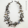 Approx. 4 strands of necklace, oblongs of New Zealand paua shell, with small round black sequins. The shell is sometimes the mottled rear of the shell, and other times the wonderful iridescent colour of the shell interior. Total length of necklace is 49 cm, and there is an extension of a further 3 cm. Pre-owned, dates around year 2000. Very good condition.