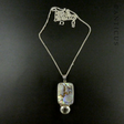 Sterling silver pendant mounted with a New Zealand paua shell oblong panel and an oval faceted green amethyst. Comes with a sterling silver fine belcher chain 54.5 cm long and 0.125 cm thick. Pendant including the bale, measures 4.5 cm high by 1.9 cm wide. Excellent new condition.