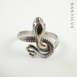 Coiled snake with its tail wrapped around the neck under the head. Band is the body and tail, with engraved scales. The head of the snake has a gold and shaped panel over the head and neck. Band is stamped 925 (sterling grade silver). band is 3.37 mm wide, and the head and coil is 1.70 mm. Pre-owned, excellent condition.