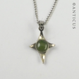Vintage star-shaped pendant mounted with a round domed piece of New Zealand jade (greenstone). The metal is probably silver plate, but could be sterling. It comes with a fine sterling silver chain, 46 cm long. The pendant or charm is in excellent condition. The chain should have a new barrel clasp, as the old one has lost its spring and has to be manually closed. This is a very cheap job to have done by a jeweller.
