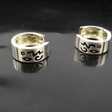Little sterling silver huggie style hoop earrings for pierced ears. Polished silver rears, and brushed silver to the design front. The motifs are niello work. The diameter of the earrings is 1.5 cm, and they are each 0.06 cm wide.