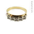 Eternity ring, 18ct yellow gold with five diamonds mounted across the face. These are set into white gold. Each diamond is approx. 1.62 mm diameter. Flat shank, tapering from shoulders to rear of finger. shoulders are 3.77 mm. Face of ring is 15.76 mm wide by 4.40 mm. Ring fitting is NZ/UK size O (USA size 7) with an internal diameter of 17.35 mm. Very good pre-owned condition, a good stacking ring. TW: 3.12g.