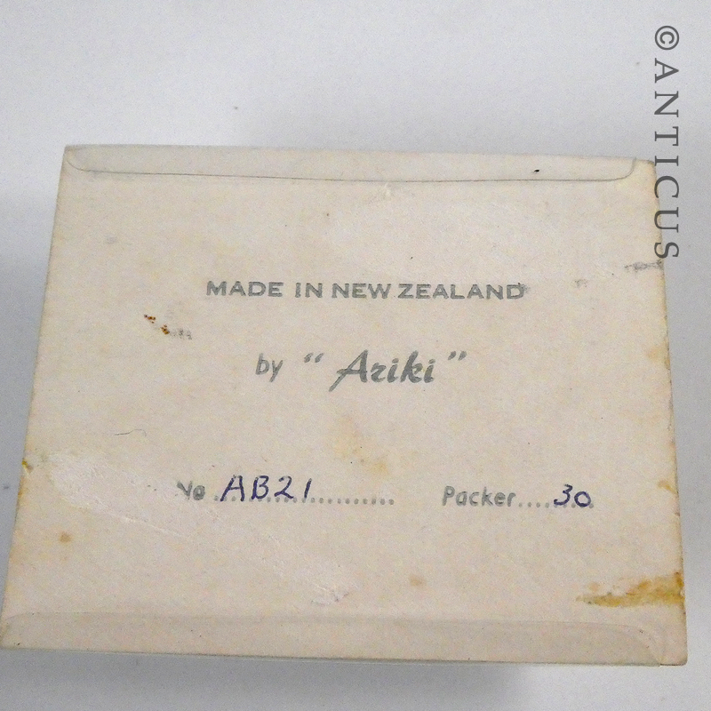 Still in its original pack, this brooch is sterling silver mounted with beautiful iridescent paua shell. Made by"Ariki" in New Zealand. Probably late 20th century. Brooch measures 2.1 cm by 2.5 cm. Excellent unused condition.
