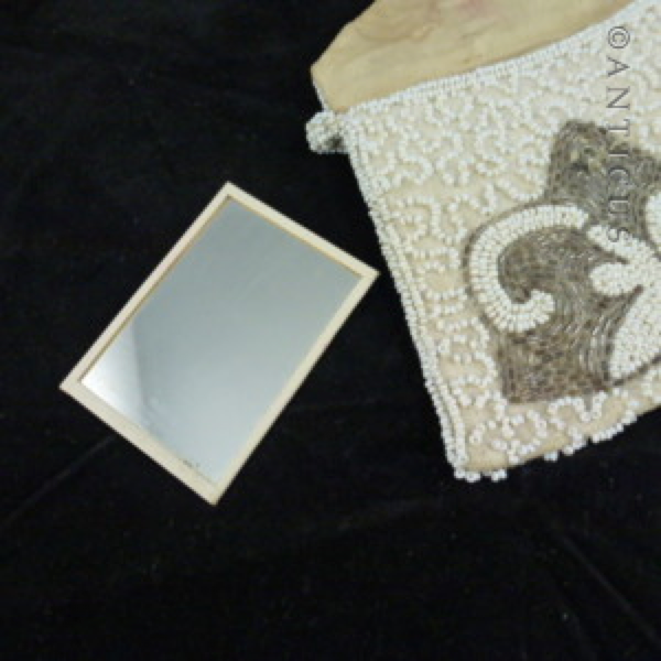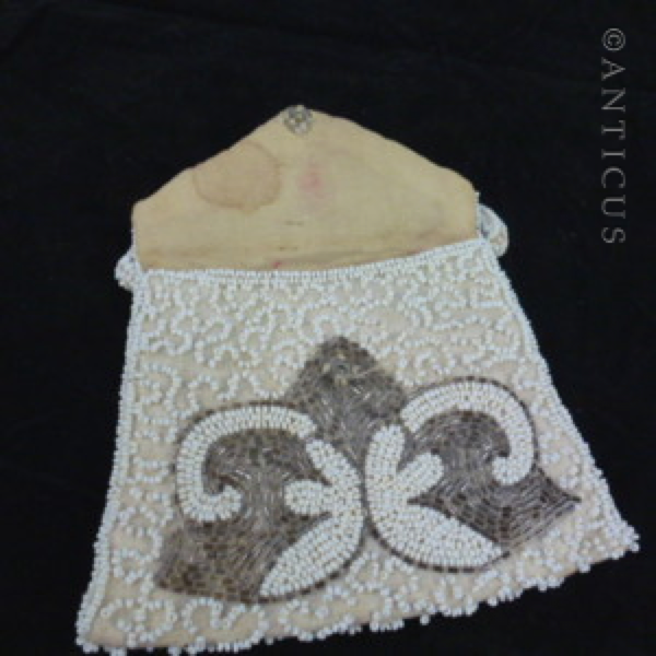 Pretty little beaded evening bag - bugle beads and white beads forming all-over pattern. Little rolled handle, also beaded. Has tag inside "Foreign Made" - this little purse would have been made in Belgium or France. It has an internal pocket containing a little mirror. Measures10.2 cm by 13 cm. Condition: stain inside flap on internal lining. An area of small loss of beads on the rear - repairable.