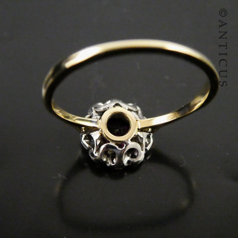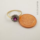 Small 18ct gold vintage ring, diamond cluster around a central ruby. Yellow gold with white gold mounts to the stones. The face of the ring is 9 mm diameter. The central stone is approx. 4.5 mm diameter. Ring fitting is NZ/UK size K+ (USA size approx. 5.1/4) with an internal diameter of 16 mm. Condition: the ruby has some abrasions to the edges of the facets - this can be seen under magnification, and is commensurate with age and wear. It came in with a broken mount under the base (the gold circle you can see underneath the ring in the last photo) - this has now been replaced. Very pretty dainty ring, probably dating mid 20th century or a little later.