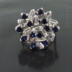 Domed cluster ring with clear white stones in oblong baguettes, and round blue stones. Possibly the stones are white spinels and blue man-made sapphires. The gold setting is 9ct white gold, with the shank area being yellow gold. British hallmark for London 1975 inside band. Face of ring measures 2 cm diameter. Basket setting, with height above the finger of 1.3 cm. Ring fitting is NZ/UK size O (USA size 7) with an internal diameter of 1.735 cm. Excellent condition. Quite retro looking. Total weight: 5.6g. Very attractive substantial cocktail or dress ring.