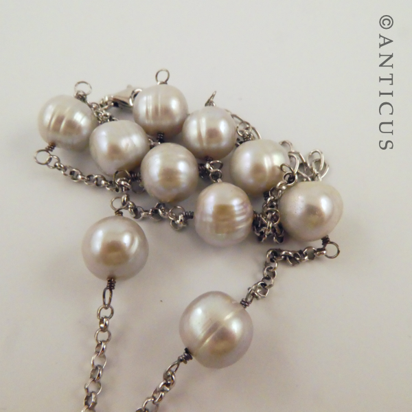 Pretty necklace, 10 grey freshwater pearls mounted on silver chain, with a tassel of a further 3 pearls - tassel length is about 5 cm. Length of necklace is 40 cm, with an extender fitted that would increase the size to 48 cm. Pearls are each approx. 1 cm diameter. Excellent condition.