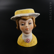 Bisque porcelain collectable head vase - this originally had a lavender sachet with net tails in the vase area, giving the hat a fine flourish. Could also be converted to a pincushion. Item measures 7.5 cm high (3 inches). Probably dates around mid 20th century. Excellent condition. These little items are very collectable.