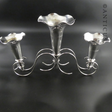 Three trumpet vases to this epergne, with a curl base. Maker is Walker & Hall. It carries a date letter for around 1924. The largest trumpet measures 21.5 cm high and 12 cm diameter at the top. The two smaller trumpets are 16 cm high and 9.75 cm diameter at the top rim. Together, the item measures 23.5 cm high by 33.5 cm wide and 12 cm deep. Very good condition. There is some wear to the plate inside the trumpets’ rim, otherwise excellent. Would make a striking centrepiece to a table when filled with flowers.