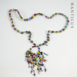Colourful necklace, the beads made from a mixture of Murano-style glass beads, turquoise and red coral chips, along with multi coloured glass beads, all different colours and types. There is a lower section the the necklace which is only turquoise and red coral chips, leading to the pendant drop which has a circle of beads and multi drops from the circle. Necklace is a total of 68.5 cm length. There is no clasp - it pulls on over the head. The pendant is around 8 cm long. The beads are all various sizes, but say approx. 8.5 cm diameter is the median. Strung on fine copper wire. Possibly dates from the 1970s.