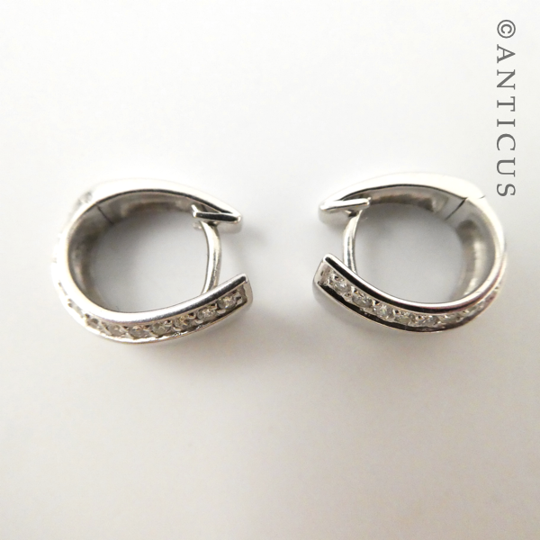 Huggie style small sterling silver loop earrings, horseshoe shaped. Hallmark on the post. They have a row of 7 cubic zirconia stones each to the side of the face of earrings to look like small diamonds. Very pretty earrings. External width is 1.2 cm, and they have a drop from the ear of 1.2 cm with an total length of 1.45 cm. They date from late 20th to early 21st century. New old stock. Excellent condition. Very on-trend now.