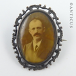 This could be a mourning brooch. The metal has oxidised, giving a black effect. Pretty frame of open-work foliage scrolls. The photo is sepia, and shows a man with a moustache. His dress could be late 19th century, or early 20th century. The photo shows traces of colour having been added to his cheeks and lips. The crystal is probably celluloid. You can change the photo by carefully folding back the metal tabs at the rear to release the locket from the frame. Item measures 3.5 cm by 2.7 cm wide. German in origin. Very good condition.